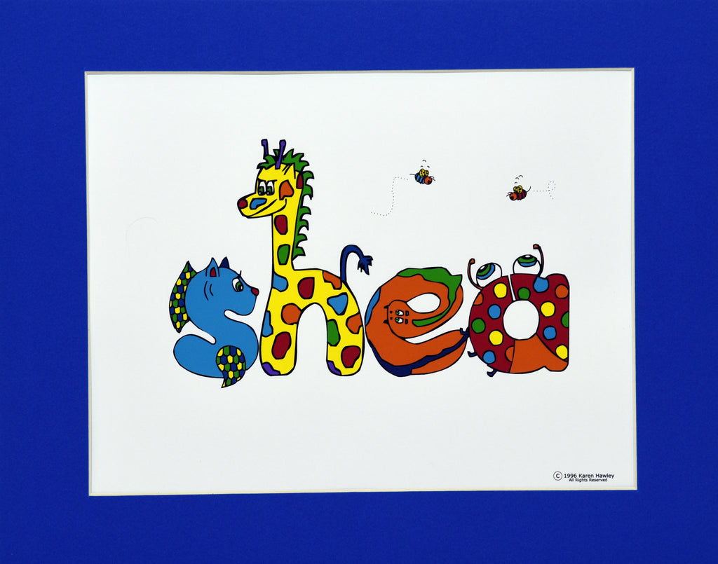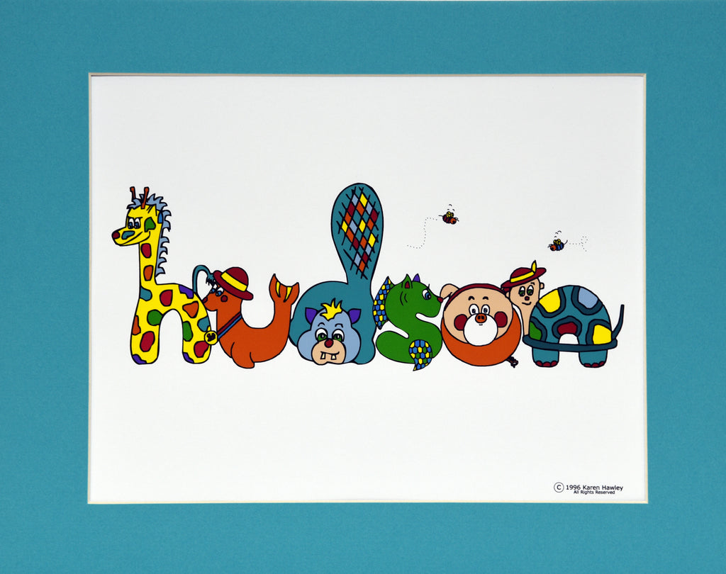 UNIQUE, Baby or Child's, personalized animal alphabet name picture in primary colours. Comes with mat colour of your choice, foam core back and protective cellophane sleeve. Fun, colourful, ONE OF A KIND gift for newborns, baby showers and birthdays. Ideal, gift for Christenings, dedications, simchat bat, baby naming ceremony, Hanukkah, Christmas, special occasions or anytime, for kids of all ages!